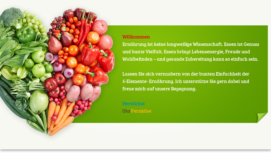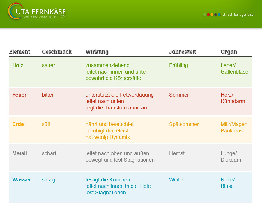 Die 5-Elemente-Ernährungslehre ist eine der fünf Säulen der Traditionellen Chinesischen Medizin (TCM). Außerdem gehören Kräuterheilkunde, Akupunktur, QiGong und Tuina-Massage zur TCM. Die TCM ist ein über 3000 Jahre altes Heilsystem zur Vorbeugung und Behandlung von Krankheiten. Die fünf Elemente sind Holz, Feuer, Erde, Metall und Wasser, die miteinander in Verbindung stehen. Den Elementen sind bestimmte Organe, Jahreszeiten, Emotionen, Wirkungen und Nahrungsmittel zugeordnet. Die Nahrungsmittel wirken in unseren Körper energetisch verschieden. Wie schon in alten Sprichwörtern beschrieben: „Sauer macht lustig“ - die Leber entspannt sich. „Was bitter dem Mund, ist dem Herzen gesund“ - bittere Lebensmittel aktivieren das Herz-Kreislauf-System.